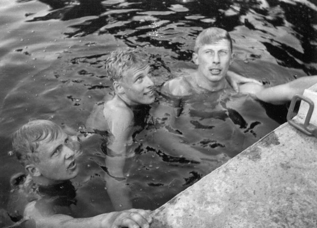 Uimarit maalissa Norja-Suomi-maaottelun 200 metrin rintauinnin jälkeen vuonna 1954. Aulis Kähkönen (oik.), Erik Gulbrandsen ja Kai Hagelberg (vas.)