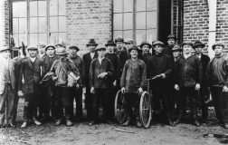 Sammon tulitikkutehtaan työntekijöitä tehtaan edustalla 1920-luvulla. Osa heistä oli epäilemässä luomassa myös kuopiolaista työläisurheilua. Kuopion kulttuurihistoriallinen museo.