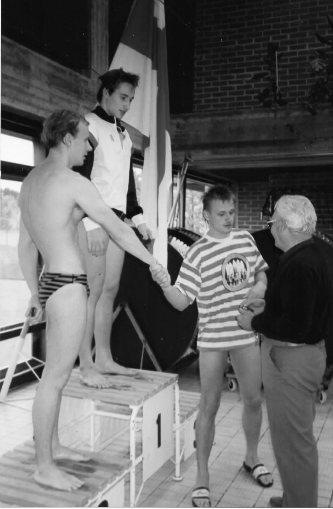 Panu Hiltunen (vas.), Tero Matkaniemi (Iisalmen Uimarit), Kari Hiltunen ja Pentti Kontinen palkintojenjakoseromoniassa vuonna 1989. KuTU:n kahdesti vuodessa järjestämät kansalliset kisat olivat tärkeitä alueellisia tapahtumia. Riitta Hiltusen kokoelma.