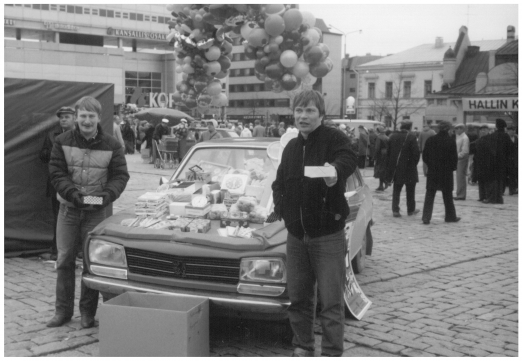 Arpojen myyntiä Kuopion torilla vappuna 1980. Martti Holopainen (vas.) ja Pekka Pakarinen. Sirpa Hiltusen kokoelma.