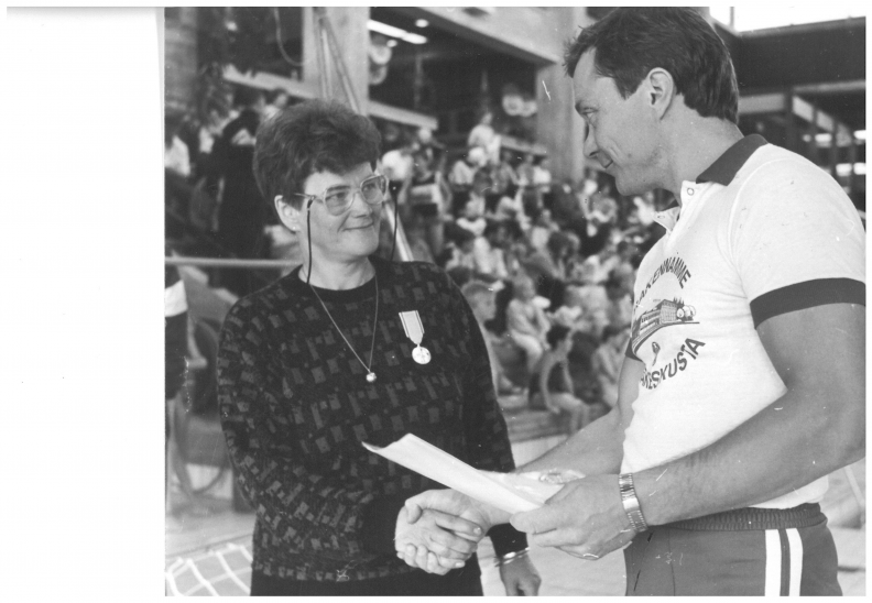 Opetusministeri myönsi Liisa Hiltuselle Suomen liikuntakulttuurin ja urheilun ansiomitalin. KuTU:n puheenjohtaja luovuttamassa mitalia Hiltuselle tapaninpäivänä 1987. Sirpa Hiltusen kokoelma.