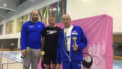 Viriilit Vinstat -kisa käynnisti masters-uintivuoden. Kokonaiskisan voittajaksi kiri Speedon Janne Virtanen (keskellä), toiseksi sijoittui Speedon Tero Matkaniemi (vas.) ja kolmanneksi Lappeenrannan Uimareiden Juha Iivonen.