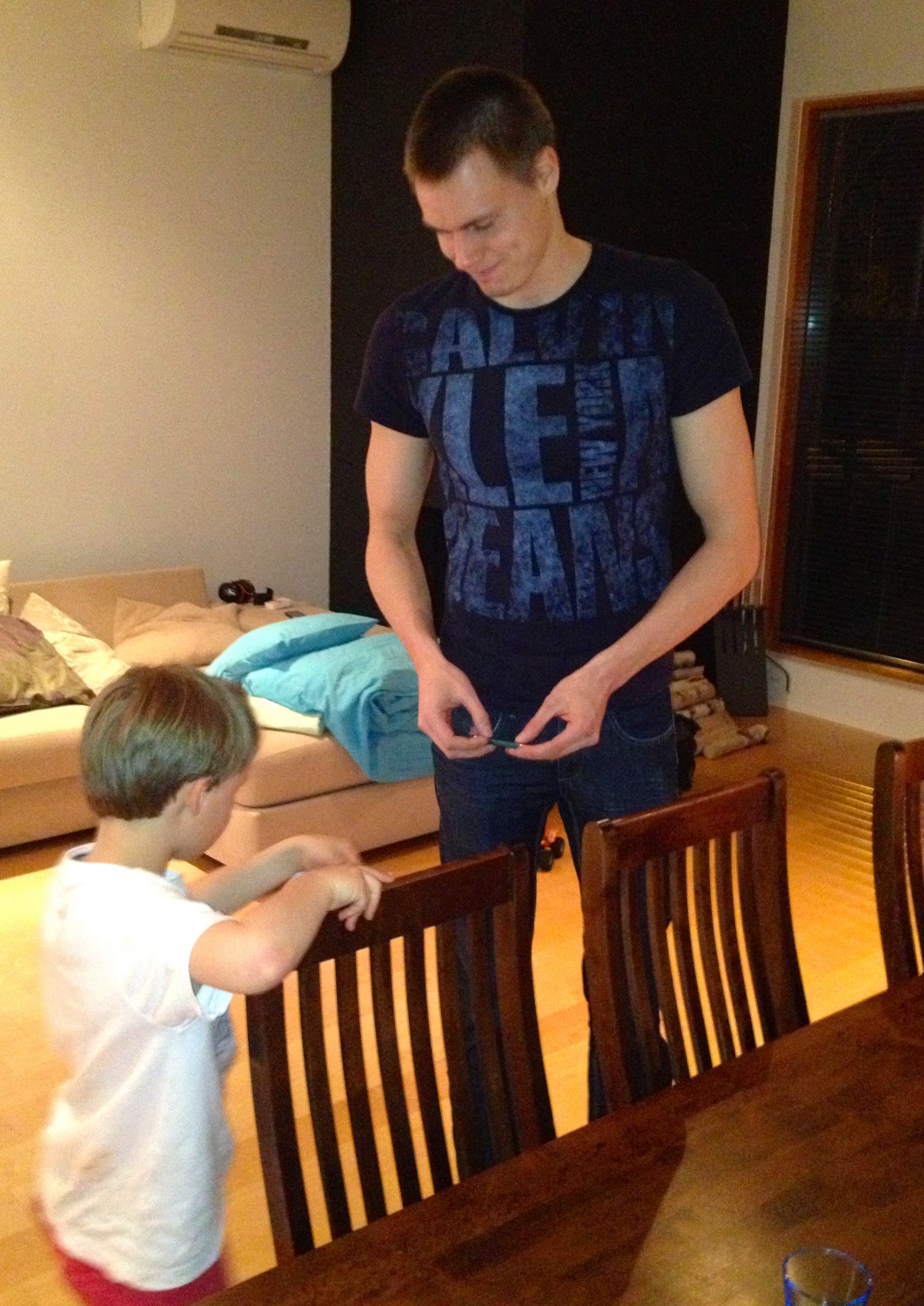 Ari-Pekka Liukkosella on laaja ystävä- ja tuttavapiiri. Kuvassa uimakoulua käyvä Viljami Matkaniemi kyselee suuremestariuimarilta, olisiko hänellä antaa fanikorttia.