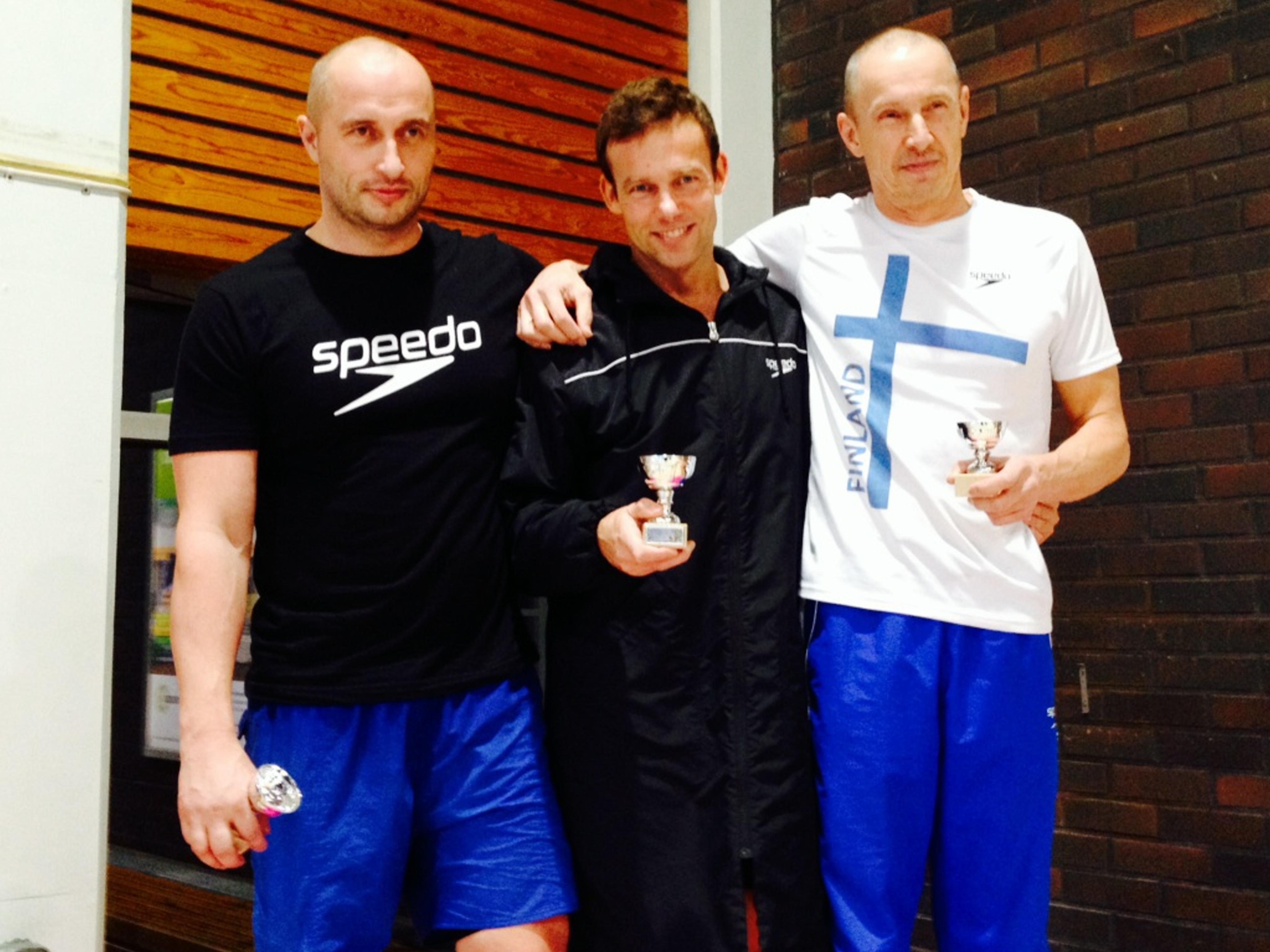 Super Masters -kilpailun miesten kärkikolmikko. Voittaja Tommy Rundgren keskellä, hopeamitalisti Tero Matkaniemi vasemmalla ja Lappeenrannan Uimareiden pronssimies Juha Iivonen oikealla.